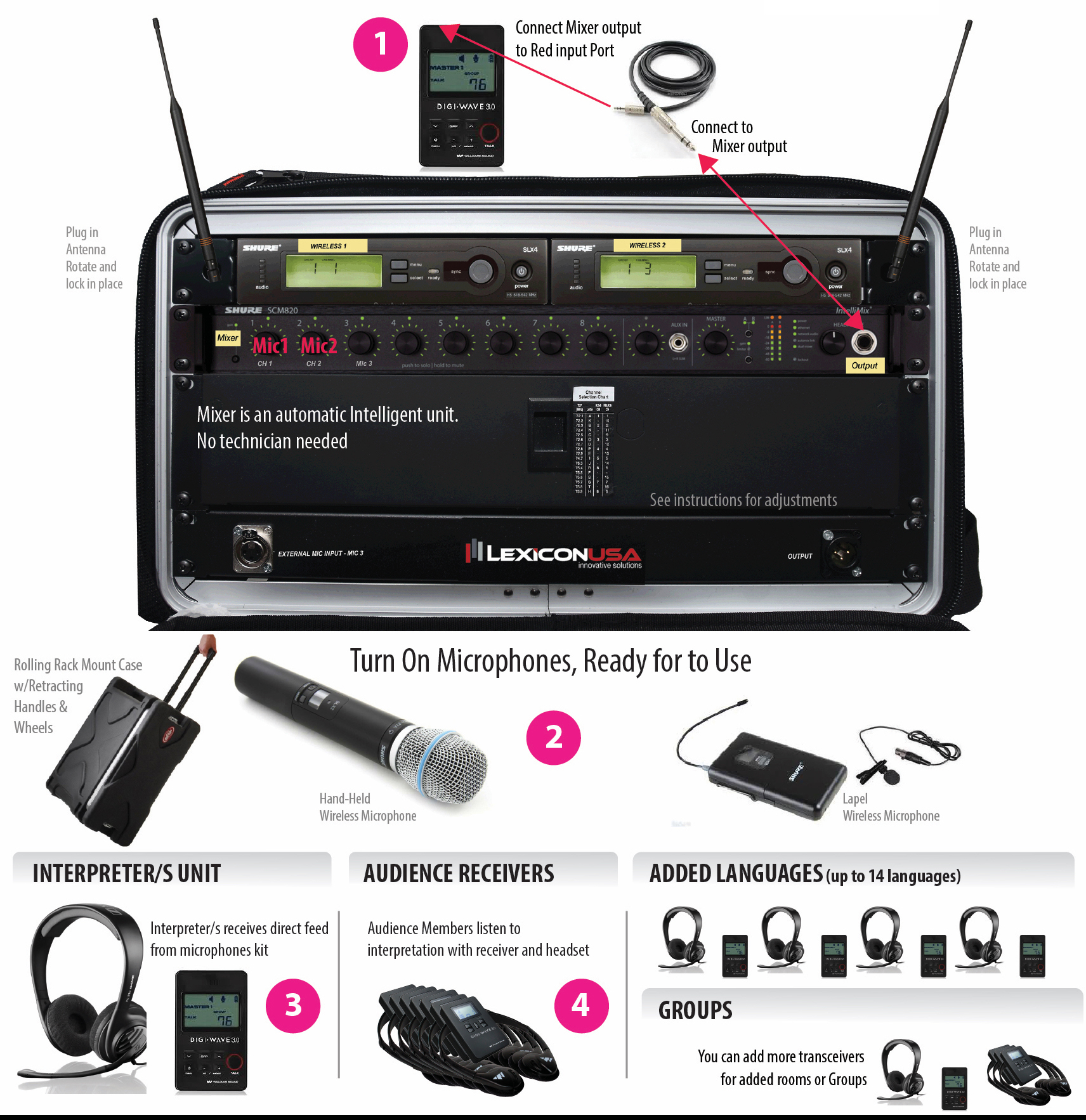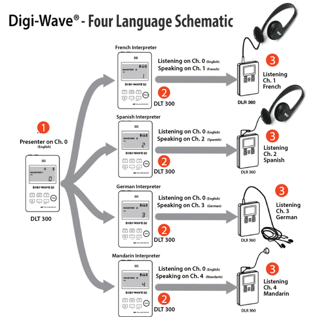 The Digi-Wave is a completely portable, wireless, single-speaker, 2-language interpretation system. Ideal when security, sound quality and flexibility are critical. Designed for small - to medium-size conferences, meetings or other events where one language is shared by two interpreters. System can serve up to 500 listeners. Additional Interpreter Consoles and DLT’s can be purchased separately to accommodate up to 14 languages. Additional DLR360's can be purchased separately to accommodate additional listeners. Ideal for a shared language / one floor / multiple language scenarios: